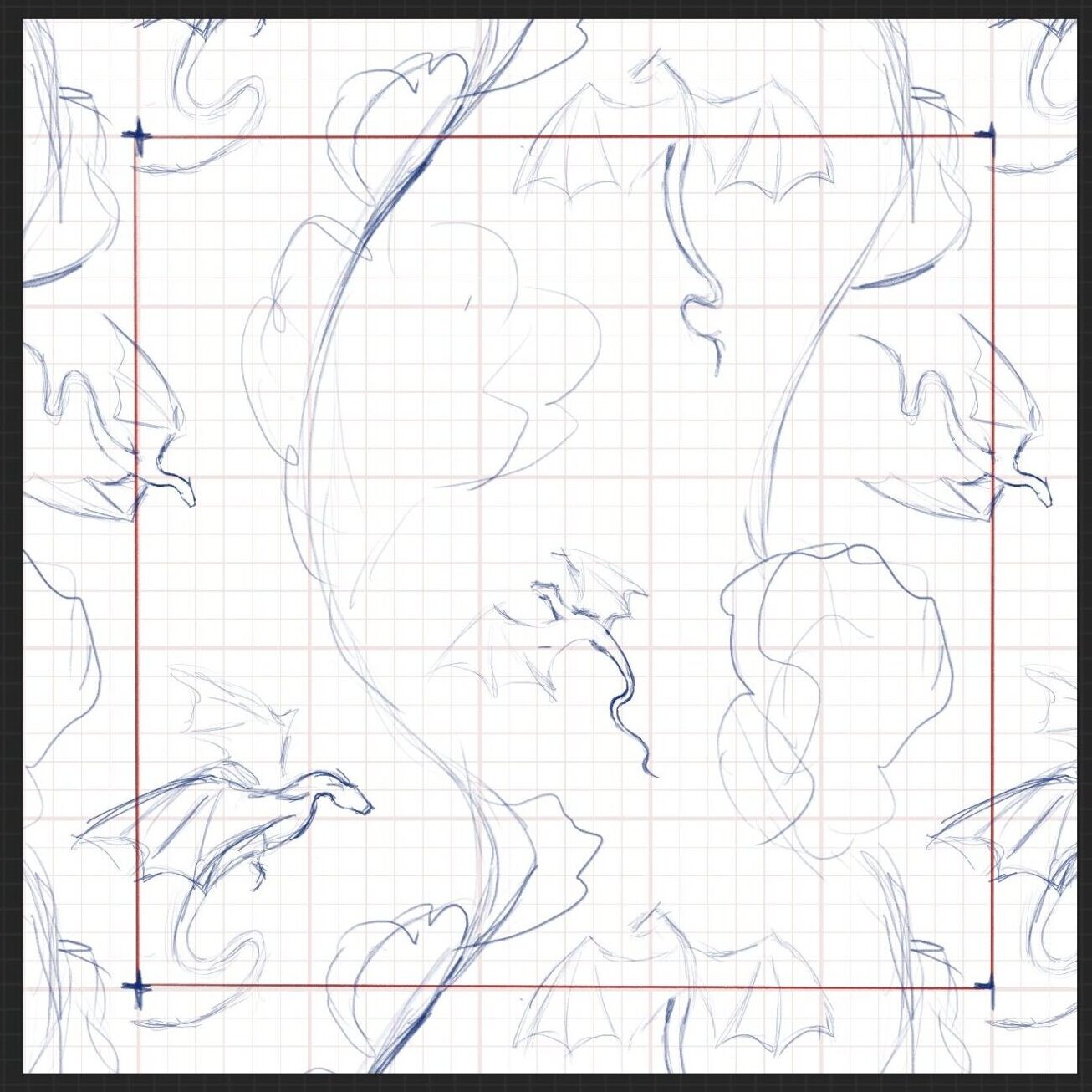 What made all of this possible was Procreate’s new brush update. It has an entire section dedicated to journaling, including graph paper. Could I have just imported a graph paper onto my canvas years ago? Yes, but the brain is not yet fully understood by science so the graph paper brush was essential. After fiddling around for a little bit, I had the concept of how to create a pattern without a tiling tool relatively established, and pretty quickly had the sketch and placement of the rose vines and dragons in place. It was time to refine the sketch; the finish line was in sight.