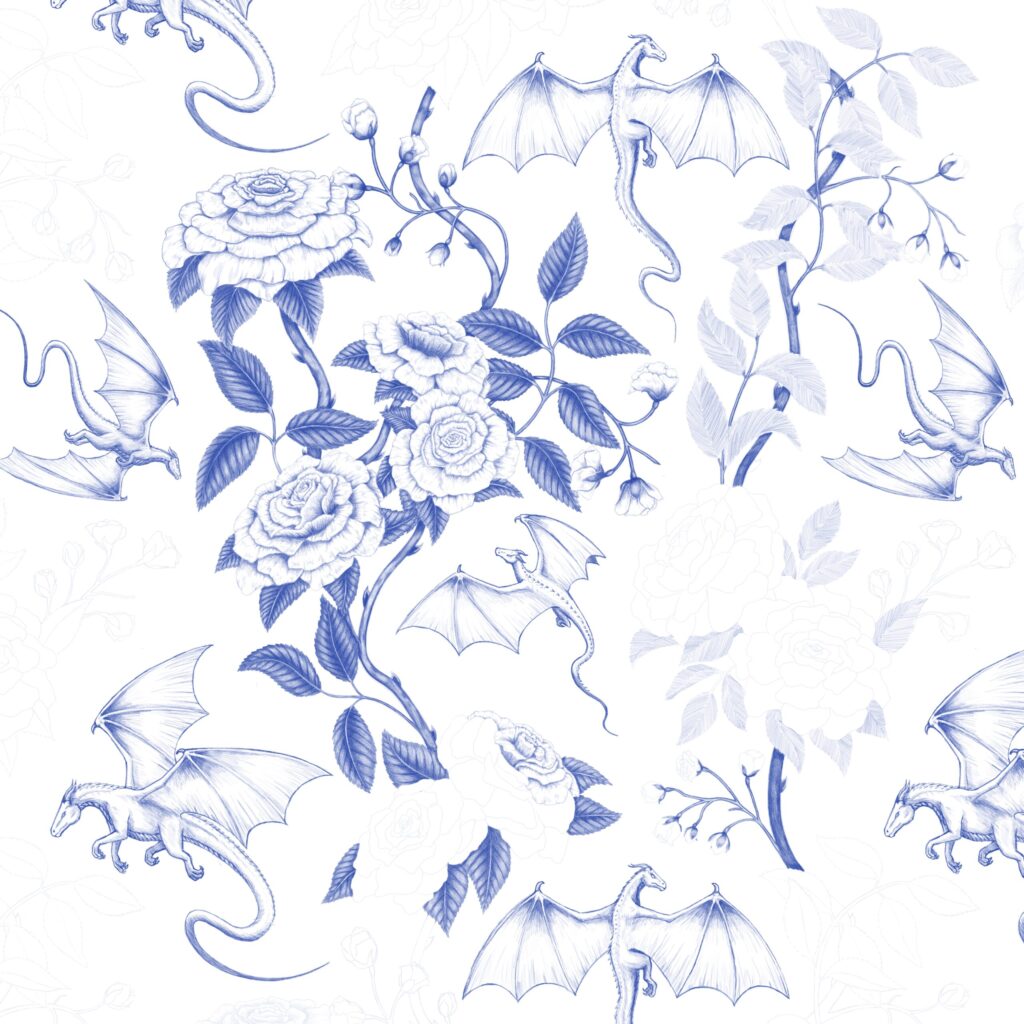 The idea started with the two themes of the books: dragons and roses. I combined them with the traditional French country pattern Toile de Jouy, the iconic fabrics of monochromatic pastoral scenes or florals on a white background. My grandmother had curtains patterned like this, and I have fond memories of watching the morning light filter through them. It seemed like a fun and relaxing project, short and sweet, quick to whip up and make wallpapers and fabrics with.