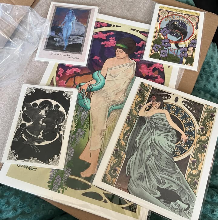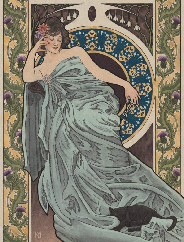 I’ve been implementing Art Nouveau styles into my art for a few years now. I always struggled defining my style, but back in 2023 I did an Alphonse Mucha study and it opened my eyes to all the possibilities. The general concepts of what I recognized as Art Nouveau, like the flowing lines, strong outlines, florals, and the the circle behind the figure, were all present and I wanted to do more. These are the ways I’ve taken those ideas and use them in my art.