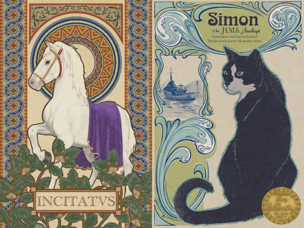 Incitatus (left) was the horse of the Roman emperor Caligula in the first century B.C.E., so I looked to the mosaics of the time to create the majority of the motifs in his design.