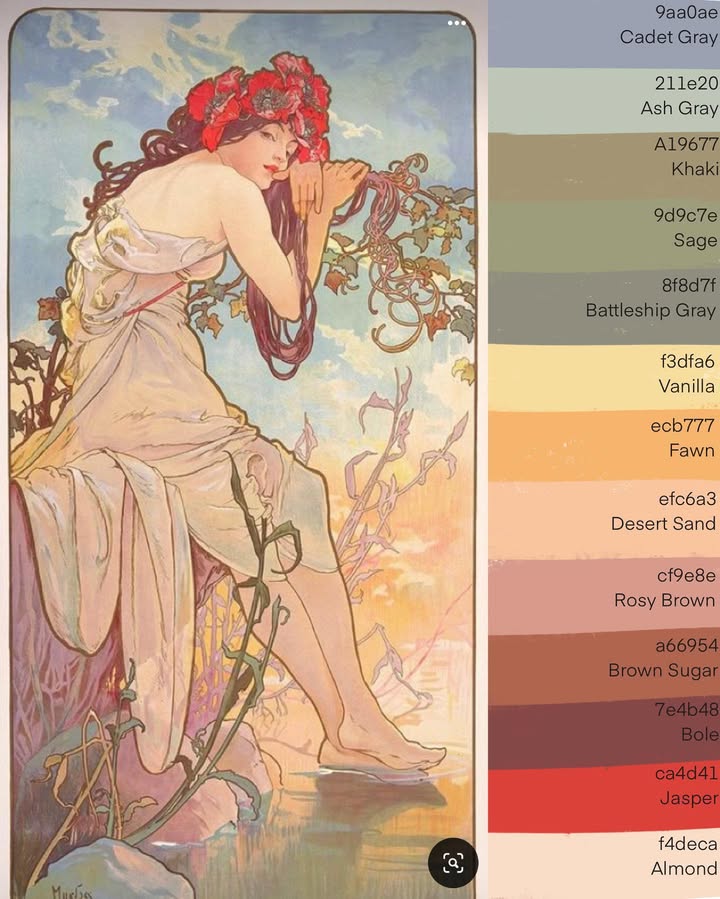 While this is definitely not a rule, some of the most recognized pieces from the time had relatively pastel and dilute color palettes. I broke down this piece by Mucha to show how light and airy the color scheme is, with the brightest color bringing attention to her face.