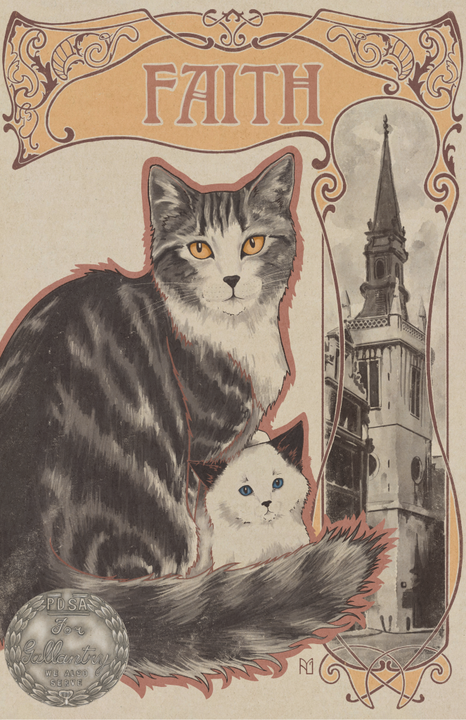 The tl:dr if you didn’t want to commit to the article is this: Faith was a stray adopted by the rector of St. Augustine and St. Faith’s Church on Watling Street in London in 1936. In 1940, shortly after having her kitten Panda, she suddenly decided to live in the basement. A few days later while the rector was out, the church was nearly completely destroyed during a German Blitz attack. The rector found her safe and sound, sheltering her kitten in the basement while the church lay in flaming shambles around them. She was awarded an honorary PDSA Dickin Medal for her courage, and when she died at the age of 14 she was buried by the church gates.